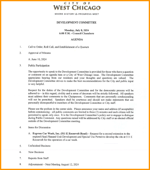 A. Express Car Wash, Inc. (511 E. Roosevelt Rd., West Chicago) – Request for a second extension to the expired Final Planned Unit Development and Special Use Permit to develop the site at 511 East Roosevelt Rd., West Chicago for the operation of a car wash.
