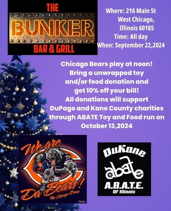 Join The Bunker Bar & Grill in West Chicago this Sunday, September 22, 2024, for a community-focused charity event featuring the Chicago Bears game at noon. Patrons are encouraged to bring an unwrapped toy or food donation to receive a 10% discount on their bill. All contributions will support local DuPage and Kane County charities via the Dukane ABATE Toy and Food Run scheduled for October 13, 2024. This event combines sports, community, and charity, providing a unique opportunity to enjoy the game while supporting a great cause.