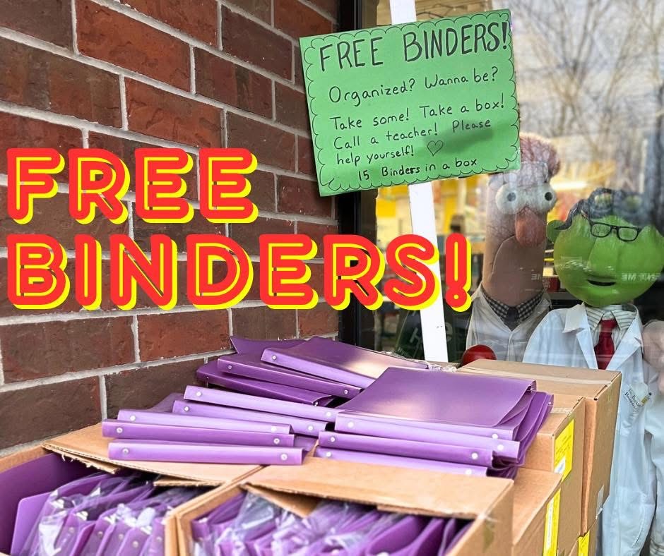 Attention teachers, students, and anyone in need of a little organization! American Science & Surplus in West Chicago has a pallet full of perfectly good binders that need homes. Whether you need just a couple or a whole box, they’re completely free!