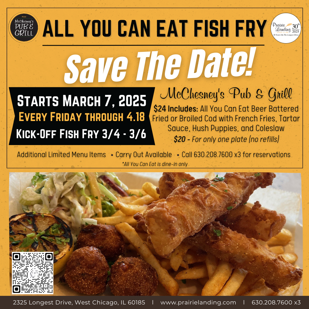 All You Can Eat Fish Fry is making a splash at Prairie landing Golf Club every Friday from March 7 through April 18. Swim over to McChesney’s Pub & Grill anytime between 11:00 AM and 8:00 PM for a bottomless fish feast that’ll have you hooked! Don’t miss out— your taste buds will thank you! Kick-offs with Ash Wednesday, March 4 to March 6 from 11 AM-6 PM.