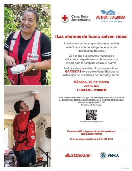 La Cruz Roja Americana, en colaboración con los departamentos de bomberos locales, voluntarios y patrocinadores como State Farm y FEMA, organizará una instalación gratuita de detectores de humo para los residentes de West Chicago el sábado 29 de marzo de 2025, de 10:00 AM a 2:00 PM.