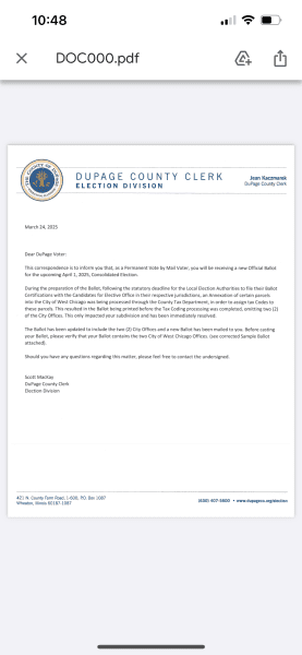 A letter from DuPage County Clerk Jean Kaczmarek’s office, dated March 24, 2025, was sent to affected voters explaining the situation. The letter states that the annexation was still being processed through the County Tax Department when the ballots were finalized, which caused the omission of “two City of West Chicago Offices” from the ballots. The Clerk’s Office confirmed that new, corrected ballots have since been mailed to impacted voters.
