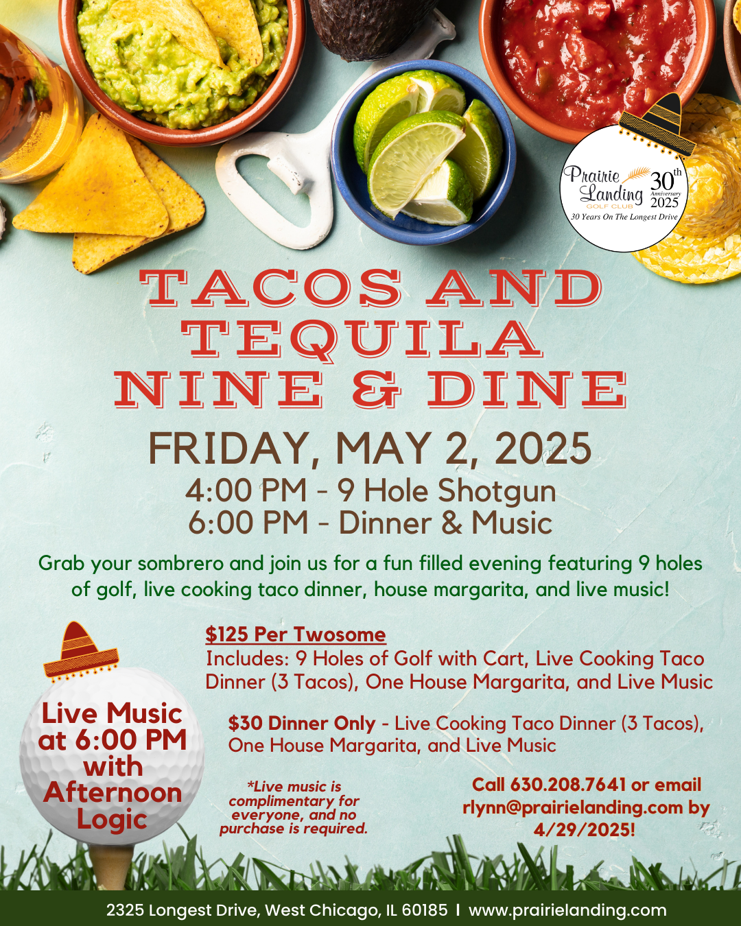 Prairie Landing Golf Club is hosting its Tacos and Tequila Nine & Dine event on Friday, May 2, 2025. The evening kicks off with a 9-hole shotgun start at 4:00 p.m., followed by dinner and live music at 6:00 p.m.