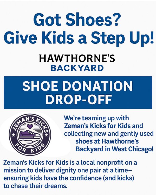 WEST CHICAGO — Hawthorne’s Backyard is stepping up to help local children — and they’re asking the community to do the same. The popular West Chicago restaurant is now a designated drop-off location for a special shoe donation drive benefiting Zeman’s Kicks for Kids, a nonprofit committed to giving children confidence through the gift of footwear.