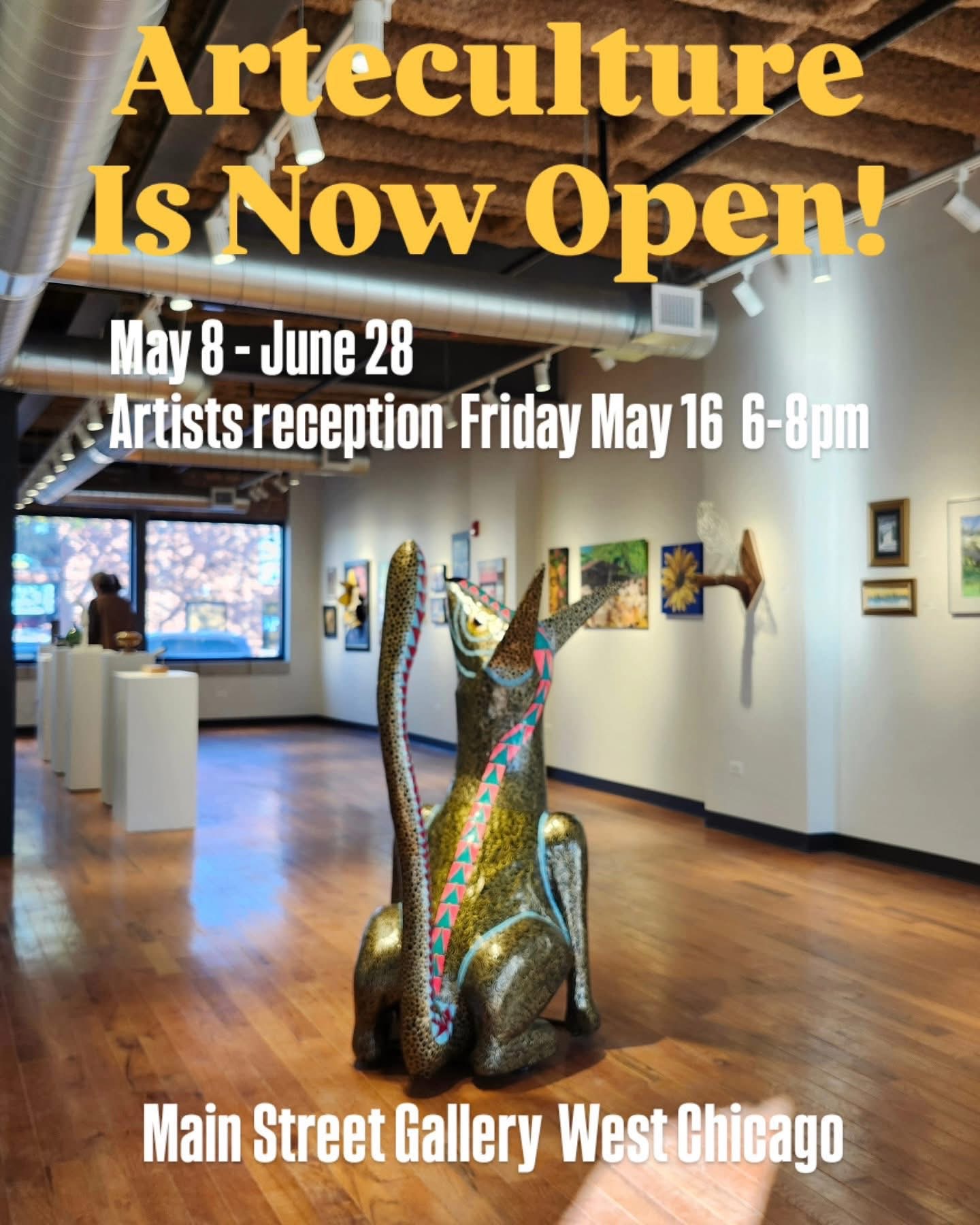 Este nuevo espacio actualmente alberga la exhibición Arteculture, presentada por la Comisión de Artes Culturales de West Chicago. La muestra estará abierta hasta junio, dando a los visitantes la oportunidad de disfrutar de una fresca exposición de creatividad local. La galería abre los jueves de 3 a 7 p.m. y los sábados de 10 a.m. a 2 p.m.
