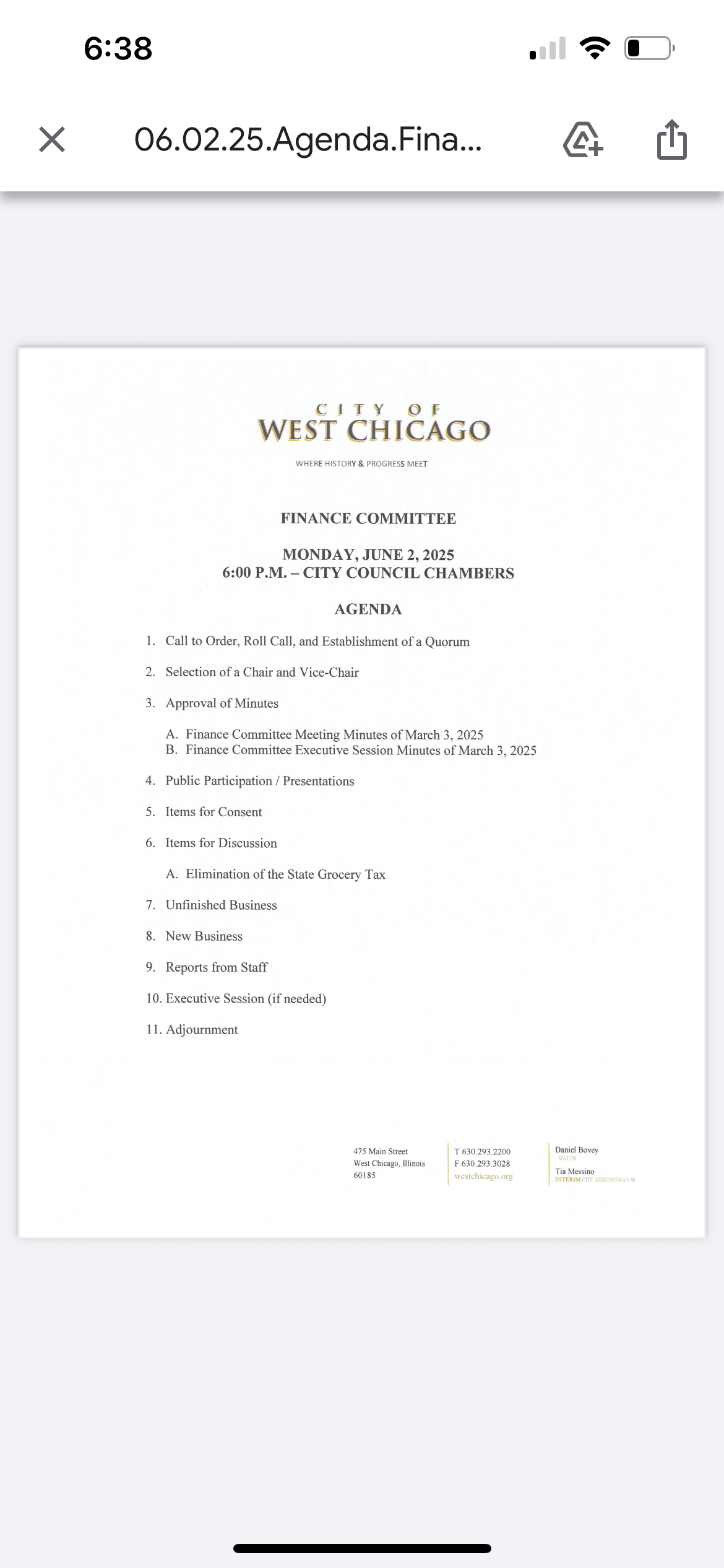 The June 2 agenda includes the selection of a new Chair and Vice-Chair, approval of previous meeting minutes, and a significant discussion item: the elimination of the state grocery tax and its financial implications for West Chicago. A memo from Finance Director Nikki Giles outlines the anticipated $425,000 annual loss in General Fund revenue once the State’s 1% grocery tax is repealed effective January 1, 2026, as mandated by Public Act 103-0781 signed by Governor Pritzker.