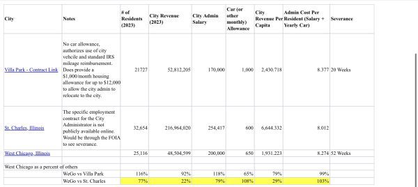 Una comparación financiera, proporcionada por ese empresario, revela que aunque West Chicago genera solo el 22% de los ingresos que genera la ciudad vecina de St. Charles, su administrador gana el 79% del salario del administrador municipal de St. Charles. Ajustado por población, los contribuyentes de West Chicago están pagando el 103% de lo que pagan los residentes de St. Charles por persona—a pesar de contar con muchos menos recursos municipales y un presupuesto significativamente menor.