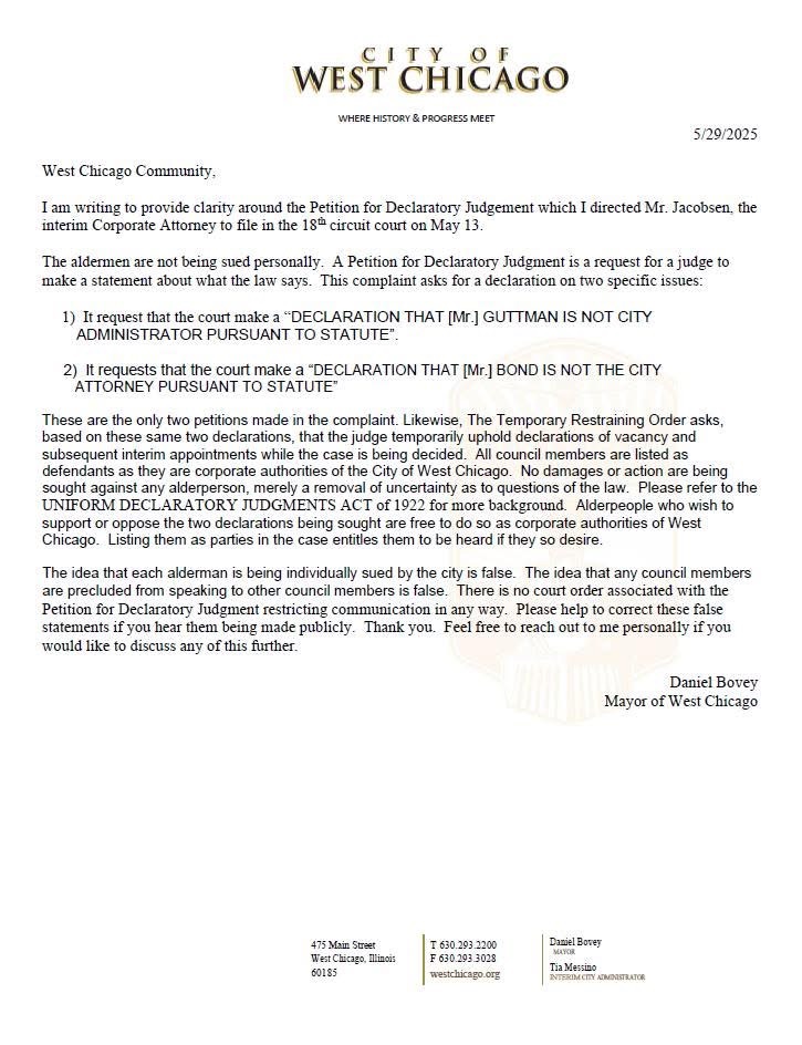In an effort to address growing confusion and political backlash, West Chicago Mayor Daniel Bovey issued an official statement this week clarifying the intent behind a recent court filing that has been the subject of heated debate both online and at City Hall.