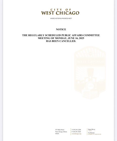 Local Government NewsCity of West Chicago’s Public Affairs Committee Meeting Agenda for Monday June 16 2025 Canceled Editor6 months ago6 months ago01 mins Sharing is Caring, WeGo!The City of West Chicago’s Public Affairs Committee meeting scheduled for Monday June 16, 2025 has been canceled. La reunión del Comité de Asuntos Públicos de la ciudad de West Chicago programada para el lunes 16 de junio de 2025 ha sido cancelada. Post navigation Previous: District 94 Board of Education Meeting June 17, AgendaNext: Summer Fest Brings Family Fun to The Shell at Reed-Keppler Park