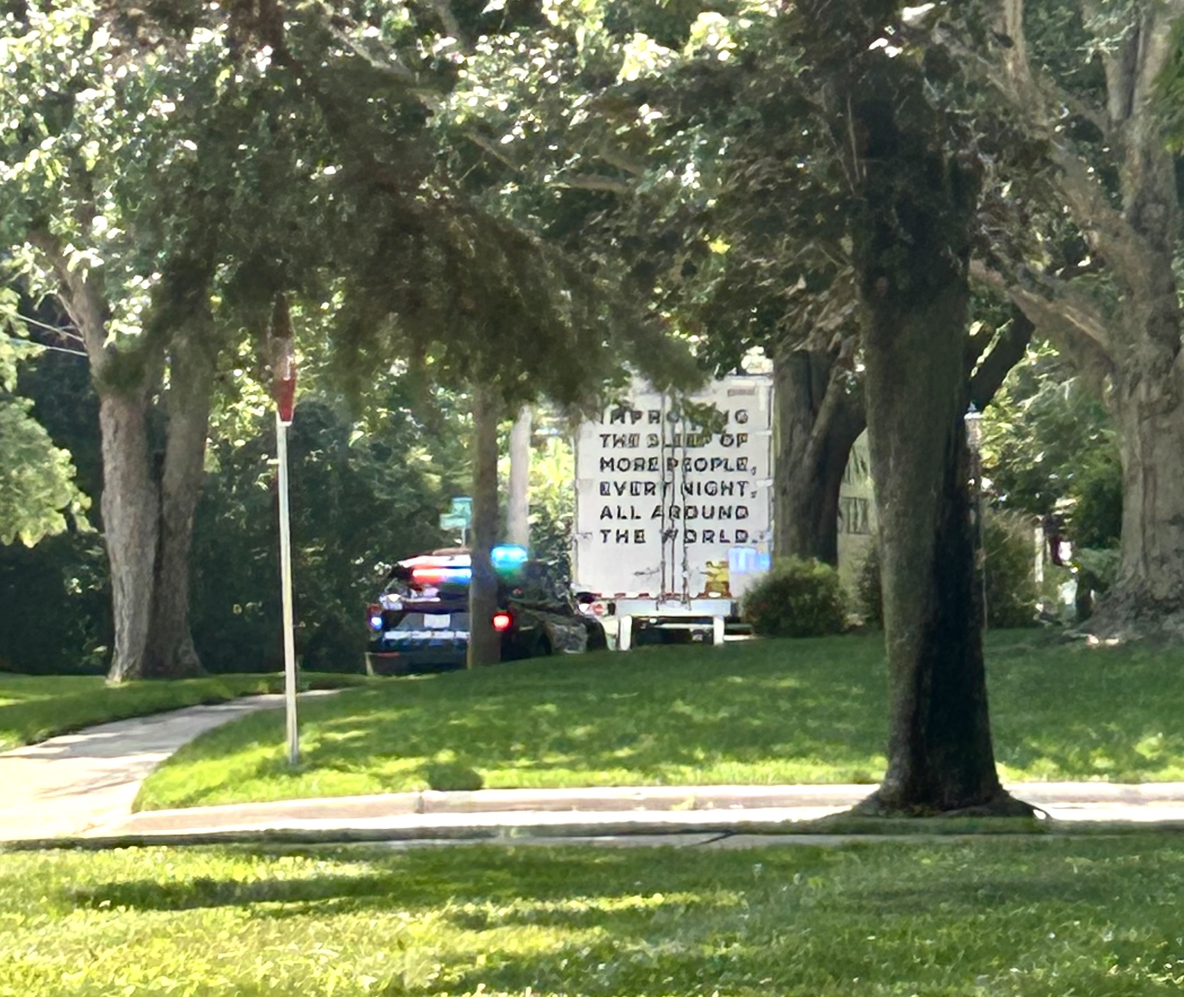 El miércoles por la mañana—apenas dos días después de la reunión—se observó a un tráiler detenido por la policía de West Chicago en Arbor Avenue, confirmando en tiempo real las preocupaciones de los residentes. Una foto proporcionada al West Chicago Voice muestra una patrulla con las luces encendidas detrás de un camión comercial grande en medio de la tranquila y arbolada calle.