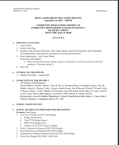 WEST CHICAGO, IL — The Community High School District 94 Board of Education will hold its regular monthly meeting on Monday, September 16, 2025, at 7:00 p.m. in the Community Room (Room 1116) at 326 Joliet Street, West Chicago, IL.