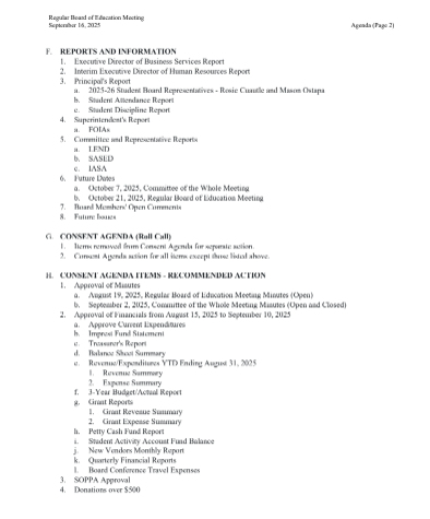 Se presentarán varios informes, incluyendo los del Director de Servicios Comerciales, la Directora de Recursos Humanos, el Director de la escuela y el Superintendente. Los representantes estudiantiles del consejo escolar, Rosie Castillo y Mason Outspa, también ofrecerán actualizaciones. Además, se compartirán informes de comités y enlaces de LEND, IASB y DWA.