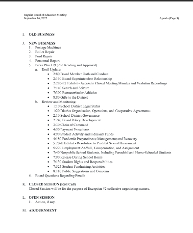 The meeting will begin with opening activities, including a salute to the flag and the reading of the mission statement by Board President Rich Nagel. Board members will also hear a request for information from Superintendent Casey Maher, who will review the process for requesting agenda items, particularly as the district transitions into the new school year with updated leadership at City Hall.