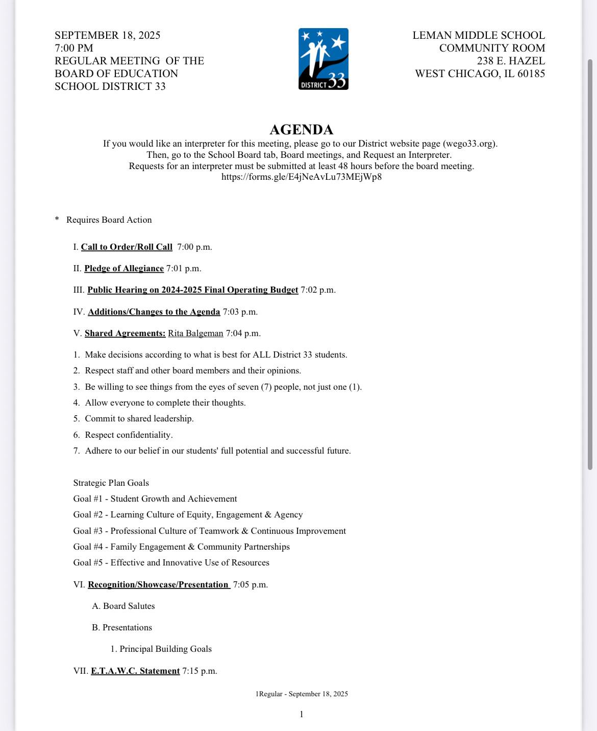 Following routine items such as roll call and approval of previous minutes, the Board will review shared agreements—a standing reminder of District 33’s commitment to student growth, respect for staff and board members, confidentiality, and collaborative decision-making.