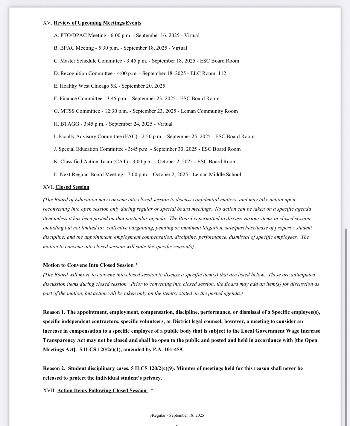 The next regular Board of Education meeting is scheduled for October 2, 2025, at 7:00 p.m. at Leman Middle School.