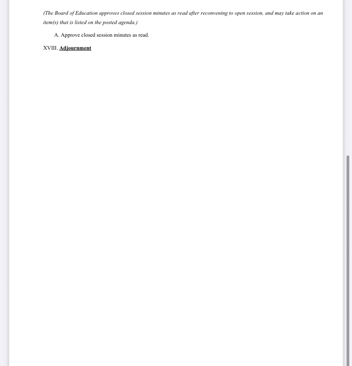 Como es procedimiento estándar, la Junta puede entrar en sesión cerrada para discutir asuntos de personal y casos disciplinarios de estudiantes antes de regresar a sesión abierta para concluir la reunión.